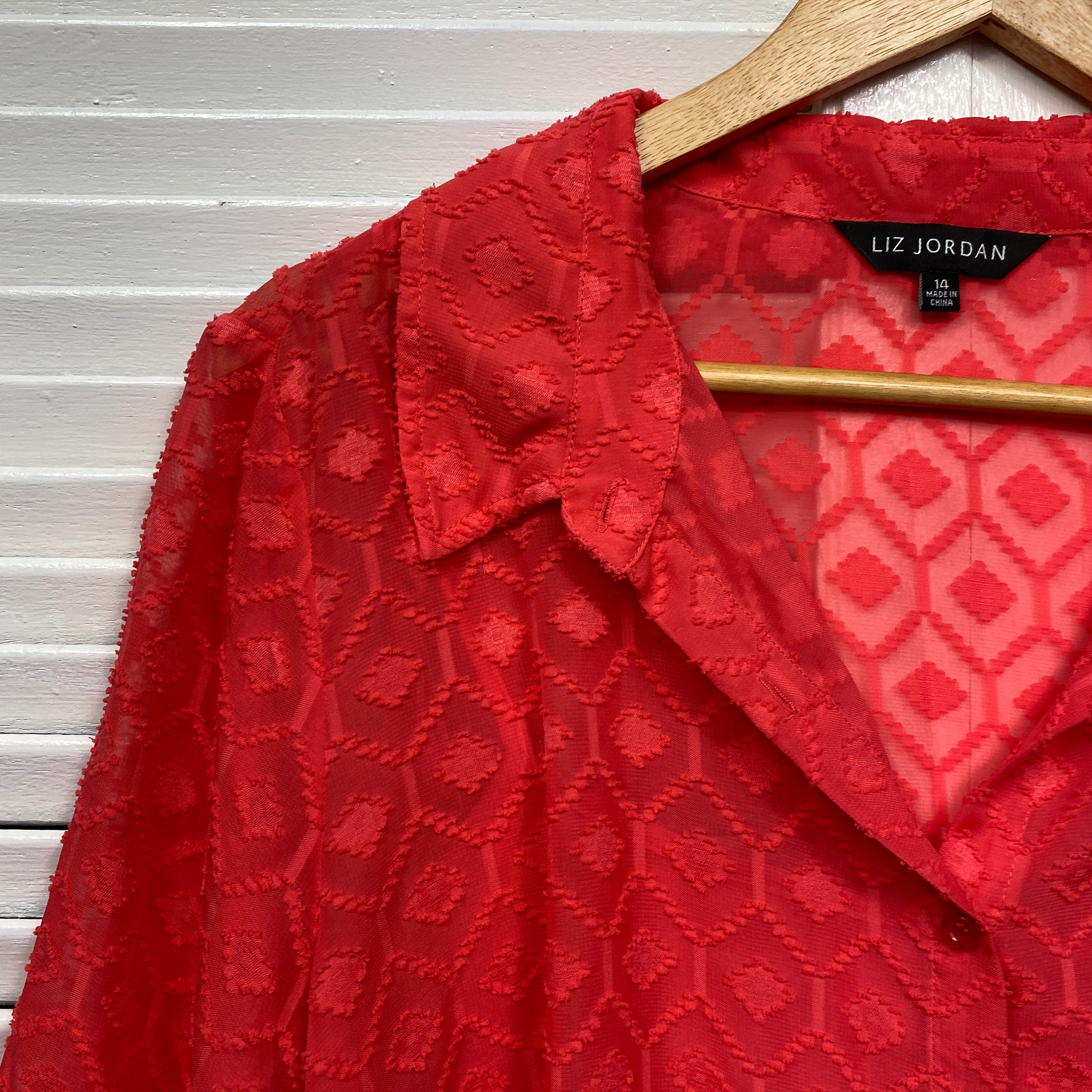 Liz Jordan Top Size 14 Red Button Up Long Sleeve Sheer